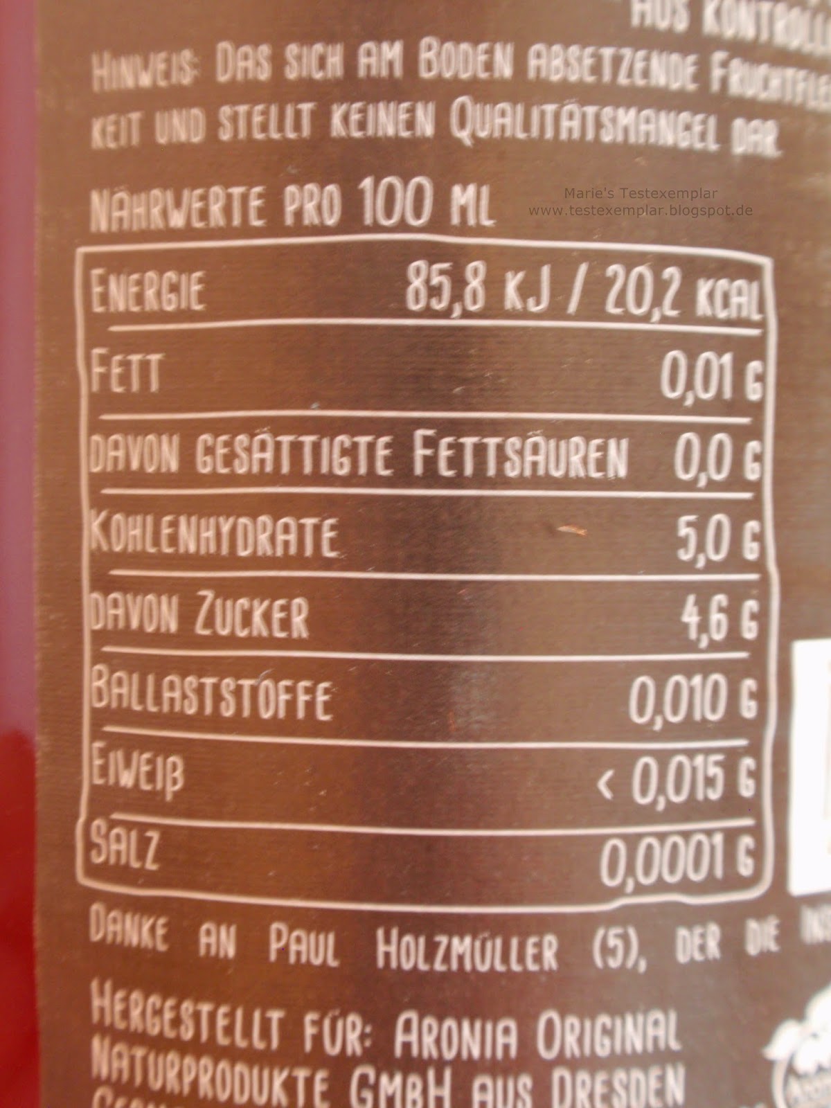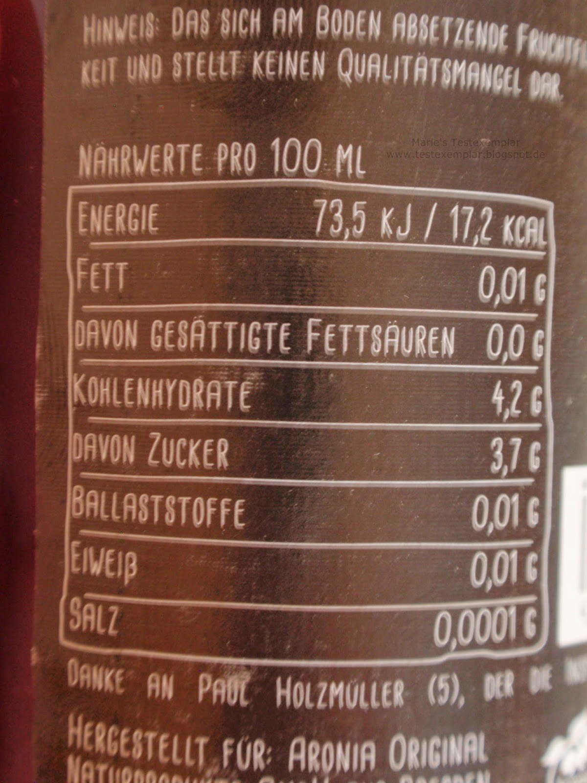 Wasser aus eigenem Brunnen, Aroniadirektsaft (9%), Rohrzucker,